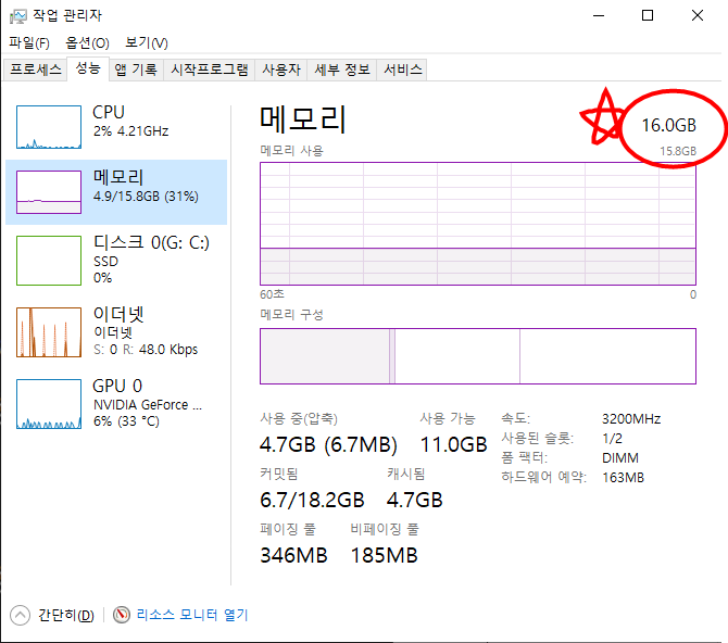 제 컴퓨터의 메모리는 16.0GB이며 15.8GB의 공간이 남아있습니다.