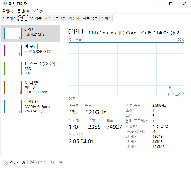 제 컴퓨터의 CPU는 i5-11400F 입니다.
