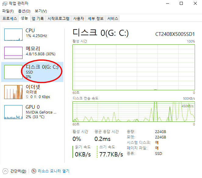 제 컴퓨터의 디스크는 SSD입니다. HHD보다 5배정도 빠른 성능을 가지고 있습니다.